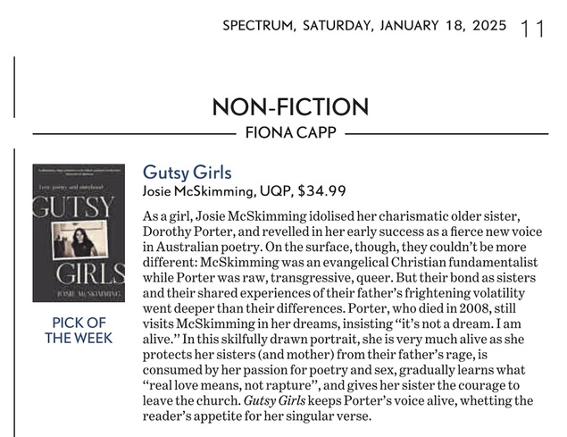Her most recent book is 'Gutsy Girls' (2025) UQP, a family memoir of her late sister, the trailblazing queer writer, Dorothy Porter. Josie has this to say about the book.
